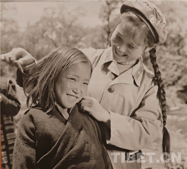 图为“解放军阿姨为我梳妆”。1959年拉萨,摄影:蓝志贵