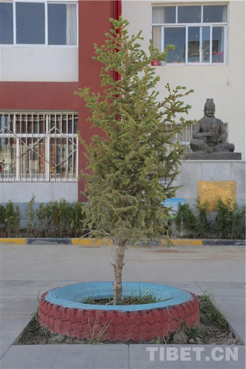 中国西藏网讯 走进西藏自治区日喀则市小学,苗木下面的报废轮胎令人眼前一亮,而这样的场景绕了广场周边一整圈。
