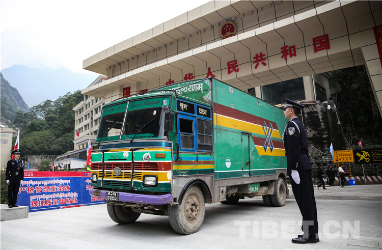 中国西藏网讯 “请收好您的证件,一路平安。”5月29日下午,随着聂拉木出入境边防检查站执勤业务科民警阮家海,完成对首辆满载中国货物的尼泊尔车辆的检查,货车缓缓驶出中国国门,标志着2015年4月25日至今,关闭了1495天的樟木口岸重新对外开放。