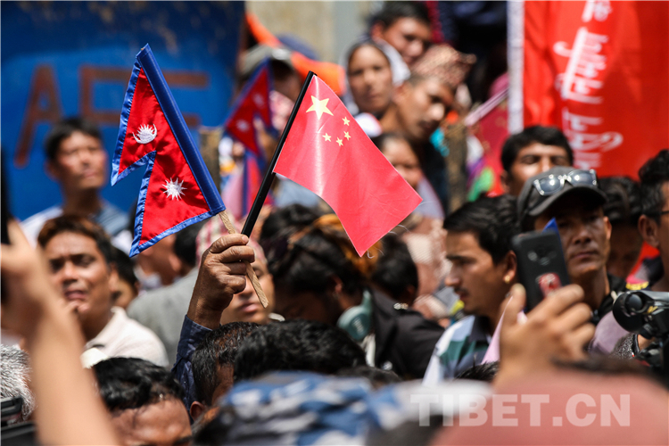 图为尼泊尔民众挥舞中尼两国国旗,庆祝樟木口岸重新开放。摄影:何宇恒