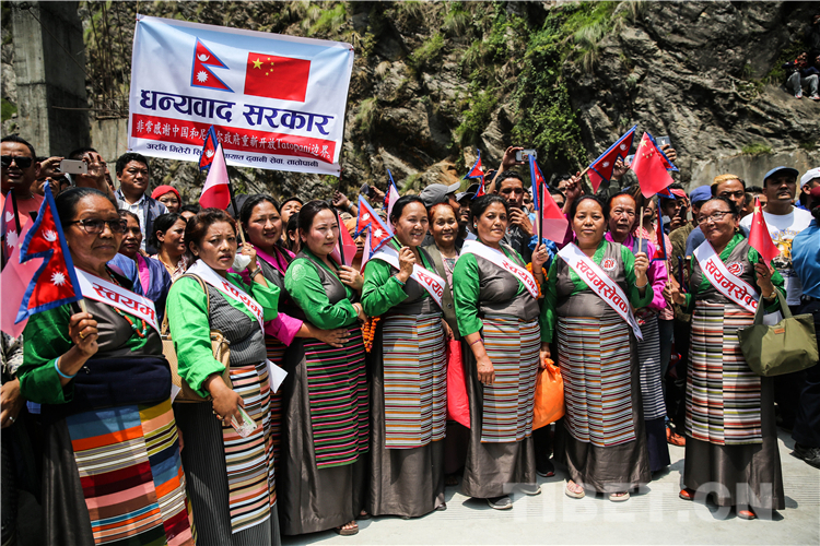 图为尼泊尔人民身着盛装来到友谊桥尼方一侧,庆祝口岸恢复货运通关。摄影:何宇恒