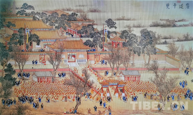 图为故宫博物院藏《胪欢荟景册》之一《釐延千梵》,该画描绘了乾隆二十六年(1761年)为崇庆皇太后庆七十大寿时,在大修过后的大正觉寺山门前,千名喇嘛共颂无量寿经的场景 摄影:孔夏