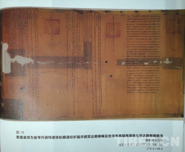 图为《西藏自治区档案馆馆藏蒙满文档案精选》中满蒙藏文合璧的《乾隆皇帝为皇考升遐特遣使赴藏诵经祈福并颁赏达赖喇嘛及各寺布施银两事致七世达赖喇嘛敕书》 摄影:李元梅