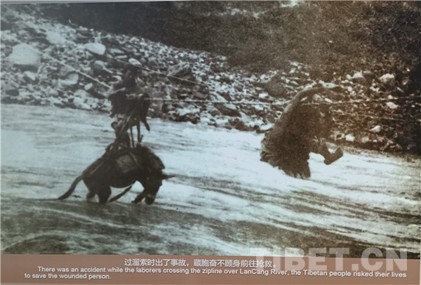 进军途中,因“大理至丽江段土工已完成百分之八十,但路基及桥梁,尚未建筑”,在运送物资时会使用当地溜索过江。图为过溜索时出了事故,藏族群众奋不顾身去抢救