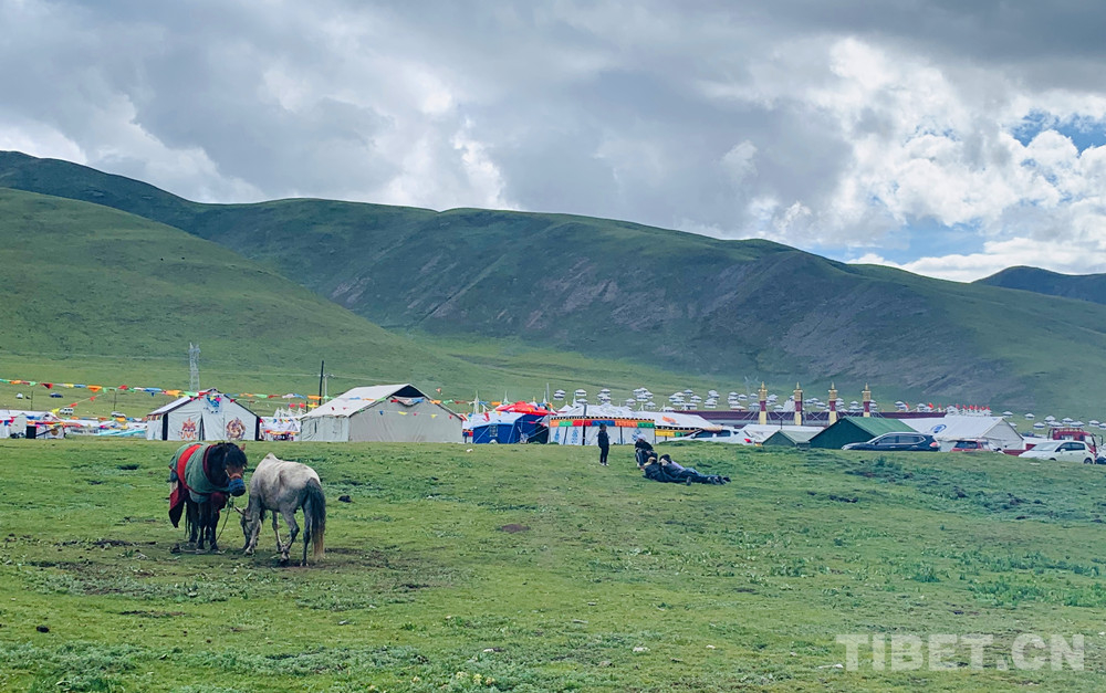 图为帐篷、马匹、经幡、休闲的牧人……点缀在称多县草场上摄影:周晶