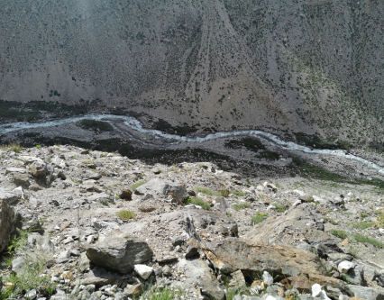 图为从纳木纳尼陡峭的山崖上向下俯视山谷中的河流 摄影:赵国栋
