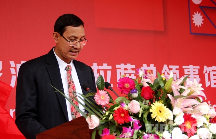 图为尼泊尔驻拉萨总领事馆总领事戈宾德•巴哈杜尔•卡尔基讲话 摄影:贾华加