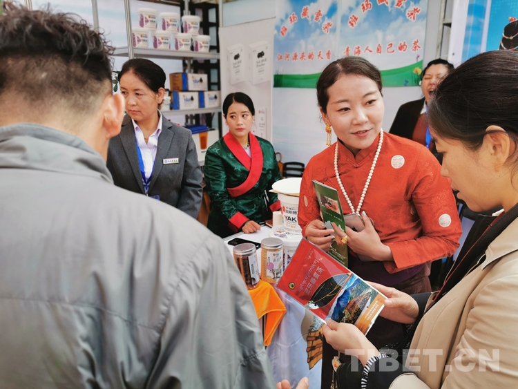 图为果洛州工作人员为来宾介绍果洛特产 摄影:泽仁措姆