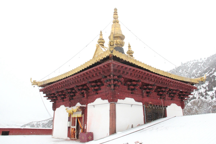 大殿三层为石头垒的墙,墙体抹白色,称为“白殿”。殿顶饰以飞檐金顶,呈飘逸升腾之势,殿顶正中竖有巨大的金顶宝珠,直指苍穹。图为查杰玛大殿的“白殿” 摄影:李元梅
