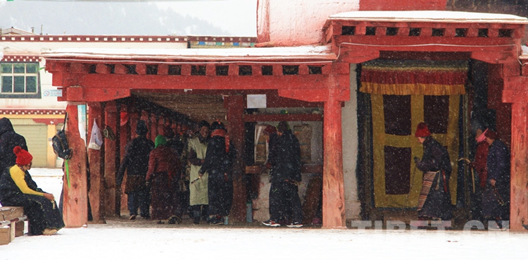 类乌齐寺已有700多年历史,查杰玛大殿为类乌齐寺主体建筑,坐西朝东,建筑主体呈四方形,高48米、建筑面积3000余平方米,造型独特,宏伟庄严,无论外观,还是内部形制,都巧妙地融合了中国藏式、汉式以及尼泊尔建筑风格。大殿高三层,层层收拢,一层为厚约2米的土墙,外涂红、白、黑三色竖形条纹,因此又被称为“花殿”。图为冰天雪地中的类乌齐寺查杰玛大殿 摄影:郑朔