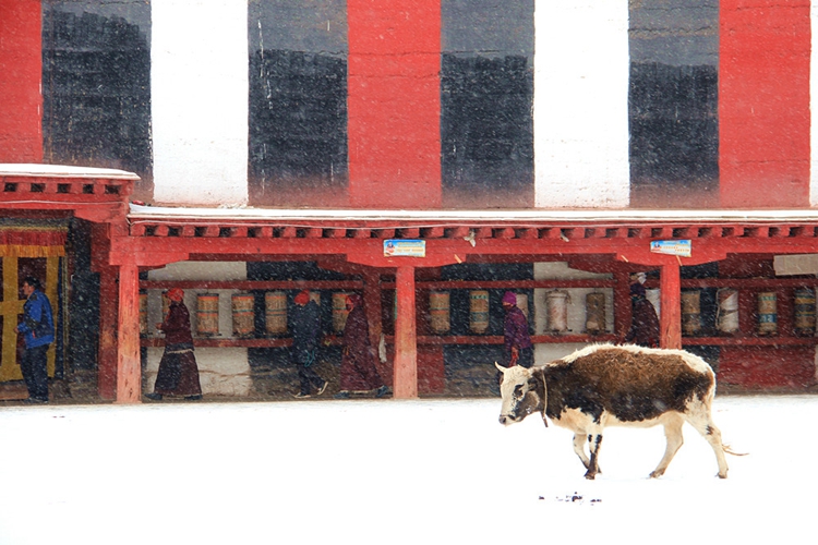 图为一头放生牛漫步于大殿外,不畏风雪,悠游自在 摄影:李元梅