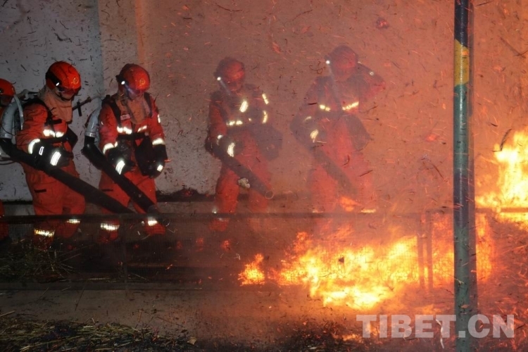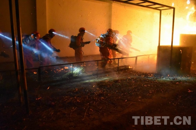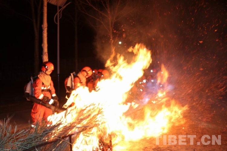 中国西藏网讯 12月17日晚,西藏自治区昌都市森林消防支队左贡中队展开了一场夜间实战训练,场面火热。图为实战训练中消防员们互相配合,扑打火线。
