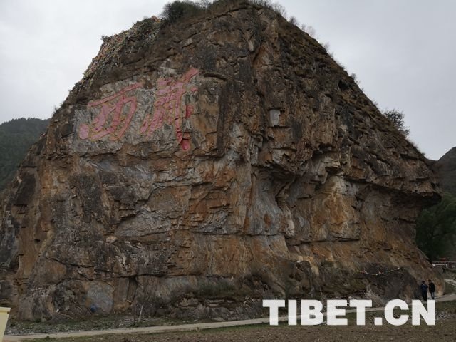 图为1950年十八军解放昌都时,解放军战士用刀在岗托渡口岩壁上刻下的“西藏”二字