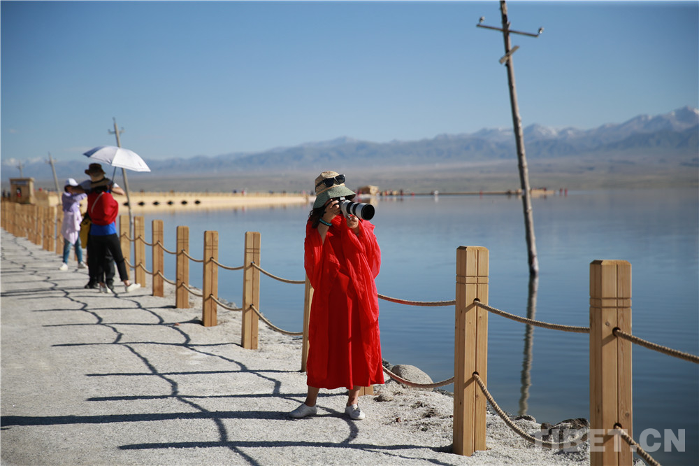 图为游客正在拍摄,红色是茶卡盐湖景区里最醒目的颜色 摄影:杨月云
