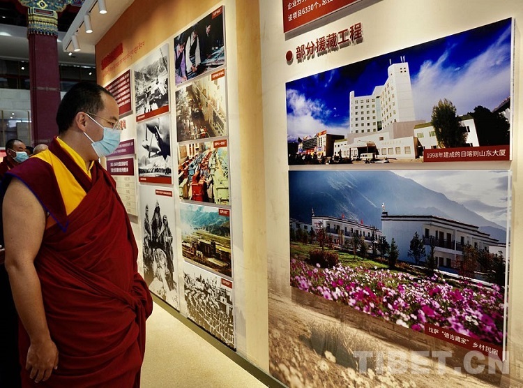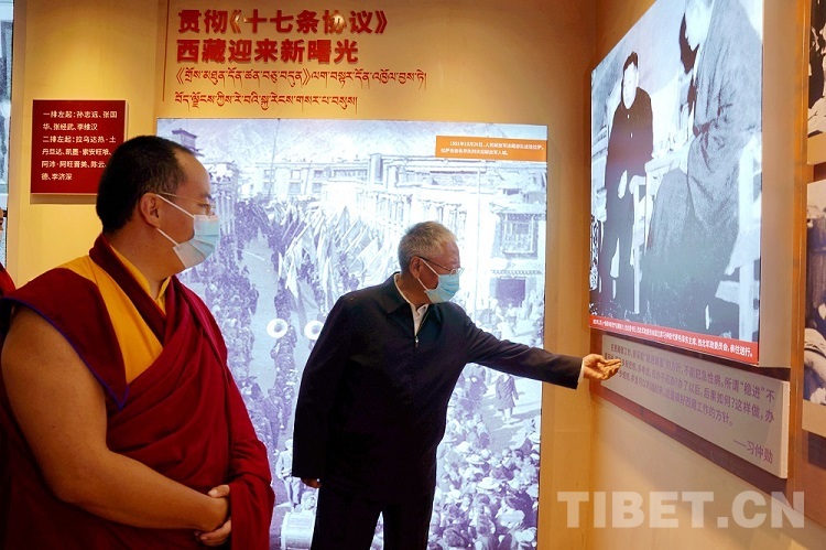 《十七条协议》签订、西藏自治区第一次人民代表大会召开、习近平总书记来信、对口援藏资金图表……一幅幅图片、一份份史料将西藏和平解放70年来,西藏从黑暗走向光明、从落后走向进步、从贫穷走向富裕、从专制走向民主、从封闭走向开放的历史生动地呈现出来。班禅不时驻足观看,详细询问有关情况,对西藏近年来各项事业取得的成就予以充分肯定。