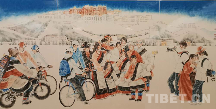 中国画作品《幸福西藏》运用中国传统绘画工笔重彩的艺术表现形式,描绘出了布达拉宫广场上民族和睦、欢乐悠闲的美好生活景象。画面中,湛蓝天空下,各民族青年相遇雪域高原,相互交流、拍照留念的场景在写实的同时,也是一种象征。画面中,人物灿烂的笑容映照出新时代西藏人民的内心喜悦,同时也反映出新时代西藏旅游环境、人文风情对各地游客的极大吸引,尤其是对青年一代的深深吸引。人群中,从他们骑着单车或是举起相机专注拍照的表情中,都能深刻感受到他们对美丽西藏的向往和好奇。画作充分体现出近年来西藏社会经济发展的蓬勃景象以及各族儿女团结互助、携手进步的美好现实。