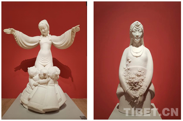 图左为《高原童声》(雕塑) 余晨星 2019 ,图右为《格桑花》(雕塑) 孙闯 2019 摄影:魏辉