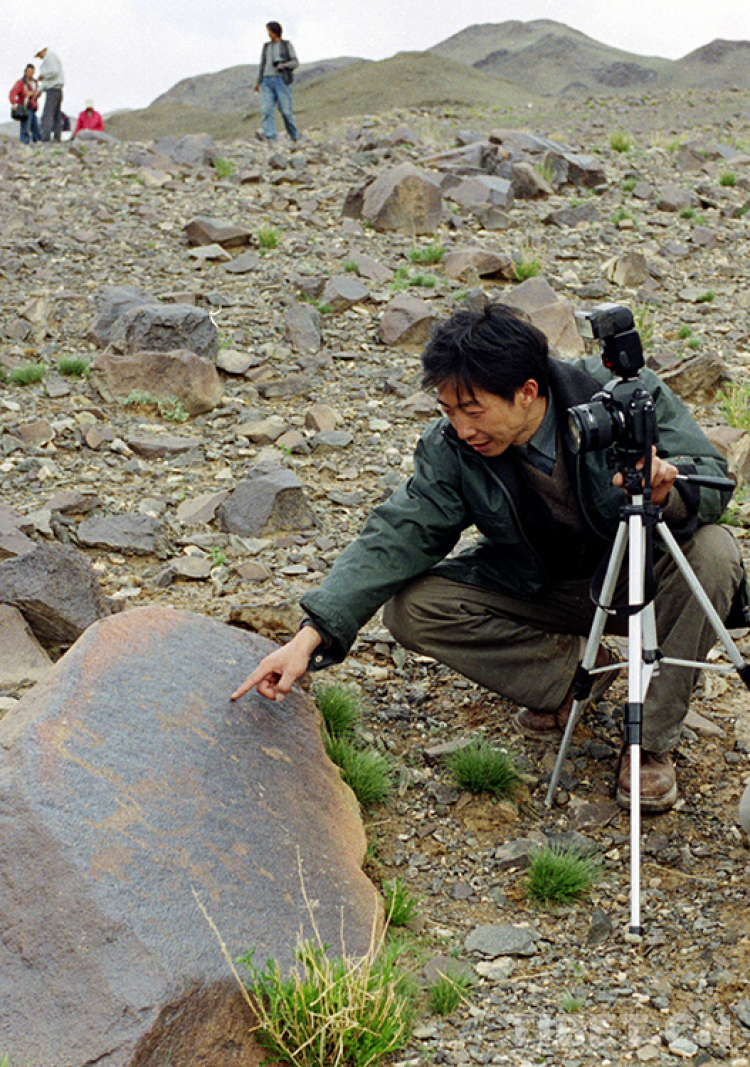 藏北高原无人区科考团人员在对尼玛县荣玛乡加林山岩画进行科考(唐召明2001年摄)