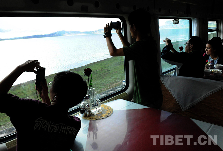 “天路”列车在通过错那湖时,旅客们纷纷用手机拍摄美景(唐召明2012年8月12日摄)