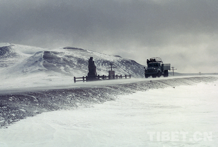 在风雪弥漫的唐古拉山上,一辆汽车正在通过山口(唐召明1991年摄)