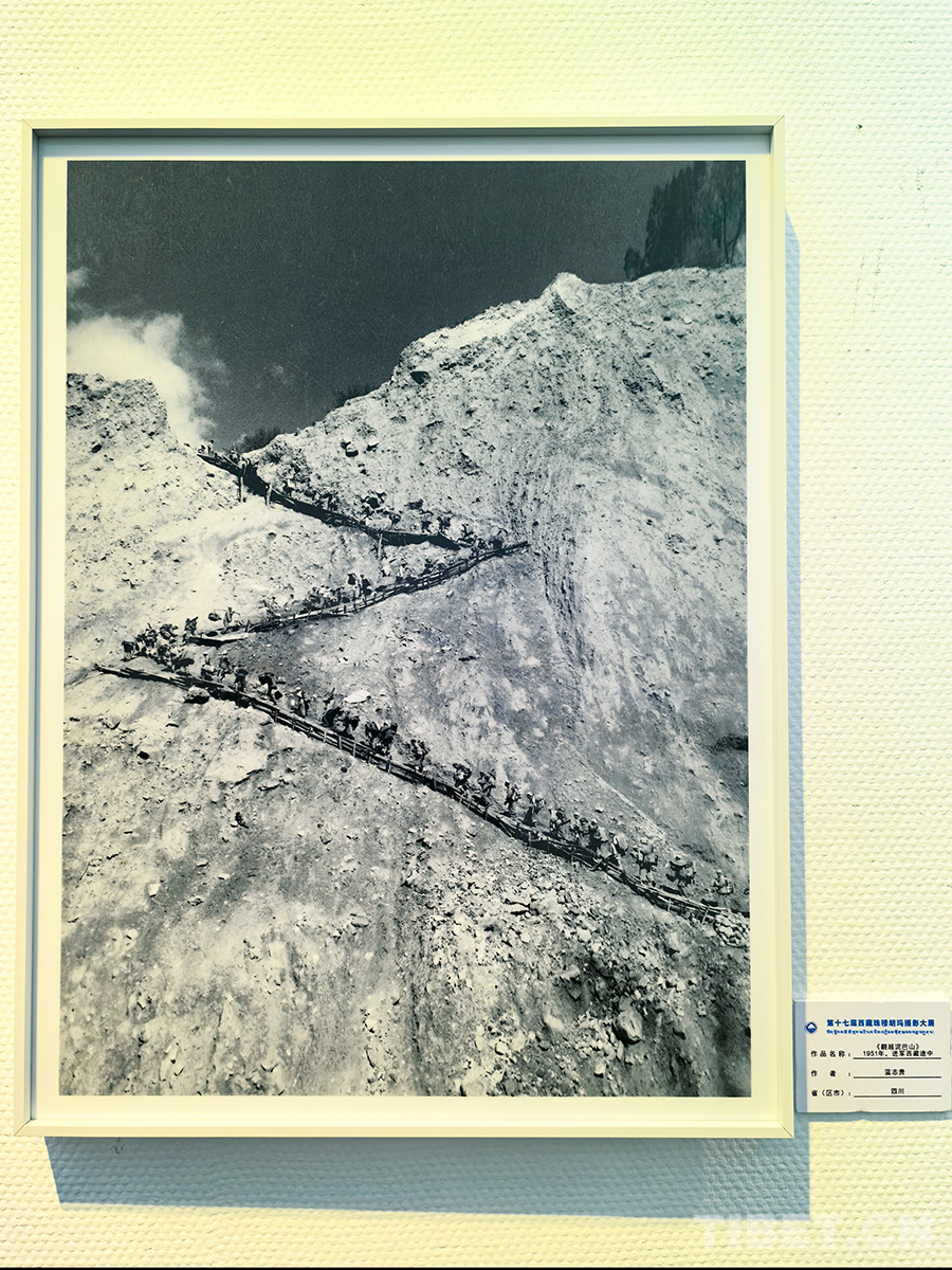 图为第17届西藏珠穆朗玛摄影大展展出的蓝志贵于1951年进军西藏途中所拍摄的《翻越泥巴山》 翻拍:王淑