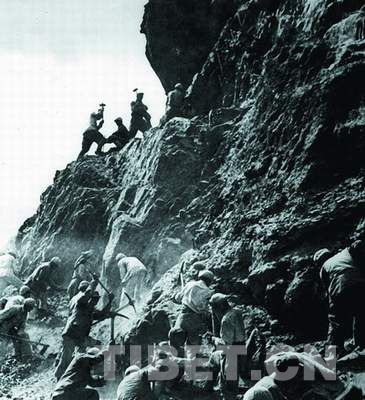 图为十八军筑路部队在绝壁上凿路 图片来源:《中国西藏》杂志