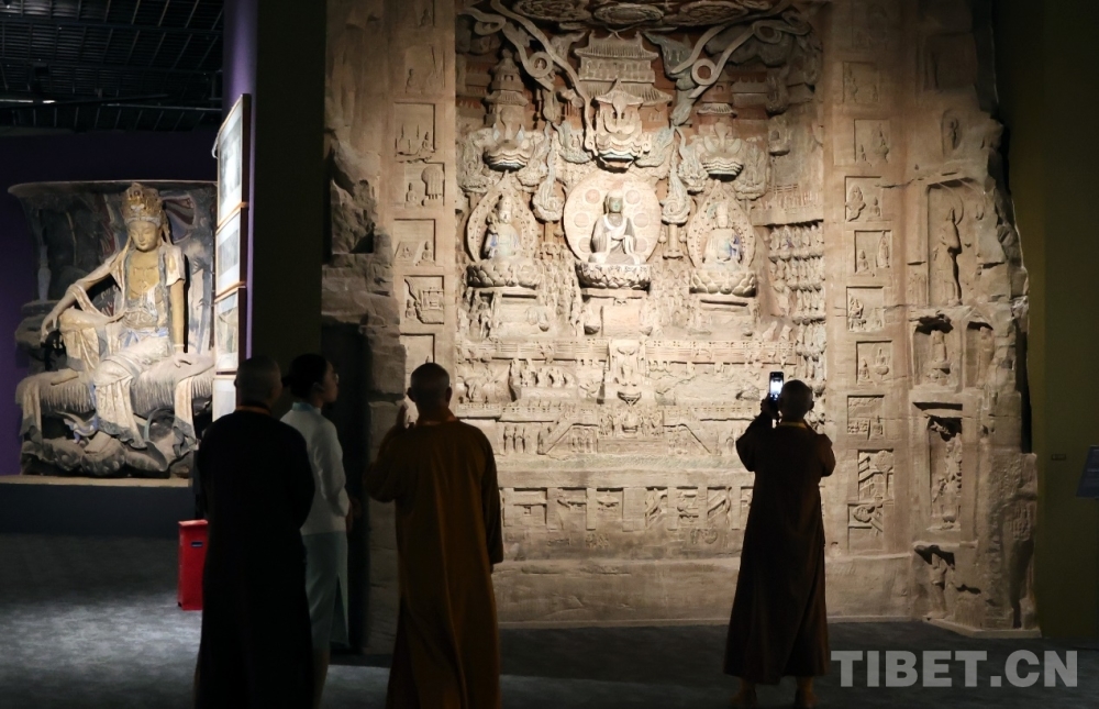 图为与会者在“翰墨佛缘——‘中国历代绘画大系’佛教艺术珍品展”上参观大足石刻北山佛湾第245龛观无量寿佛经变相龛(3D打印复制)