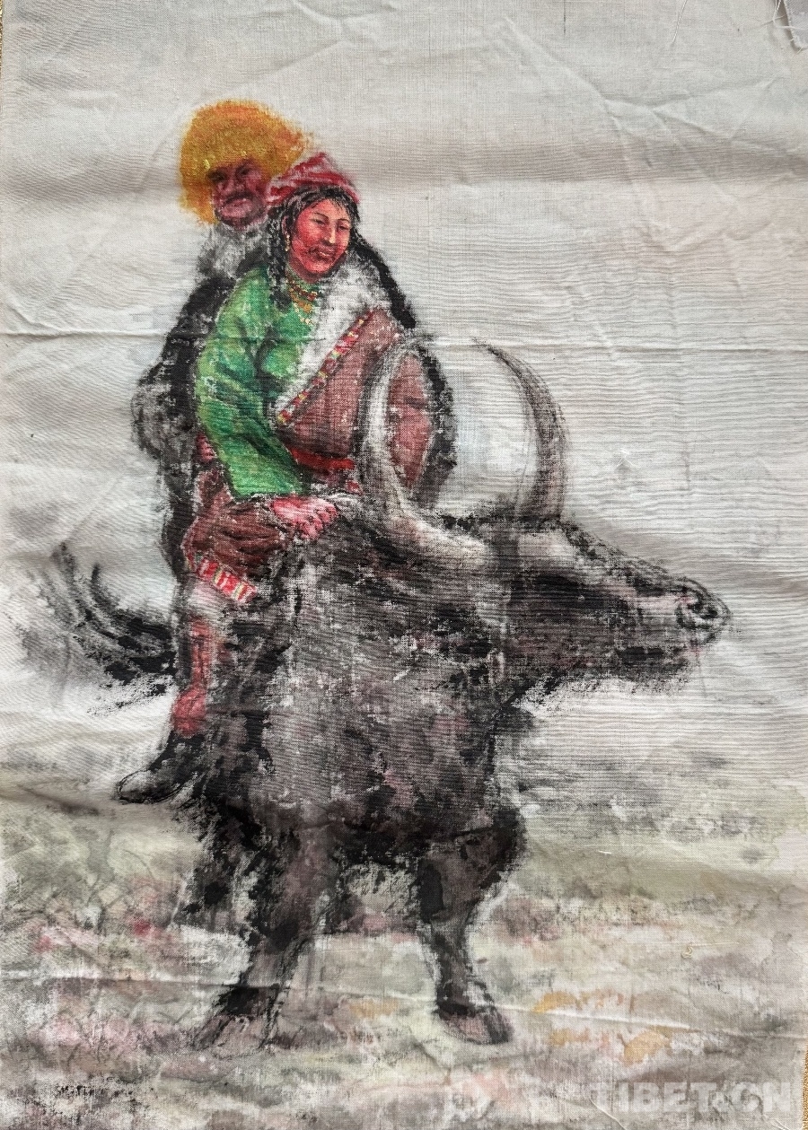 图为王万青手绘自己和妻子骑牦牛外出送医送药的情景 摄影:易文文