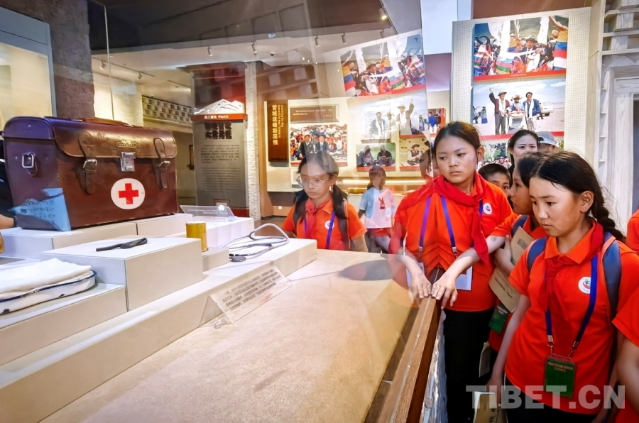 图为西藏阿里噶尔县孔繁森小学师生在孔繁森同志纪念馆仔细阅读国家一级文物、孔繁森小药箱的介绍 摄影:刘莉