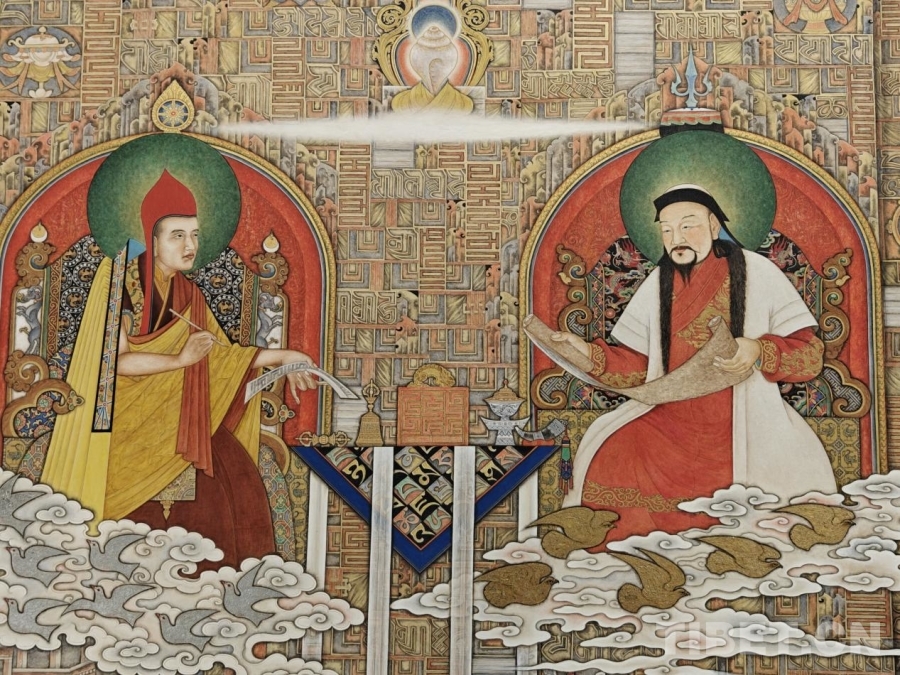 图为展览现场展出的作品《忽必烈与帝师八思巴》