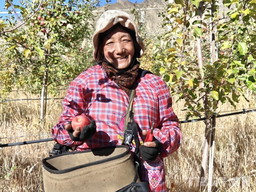 图为山南市贡嘎县吉雄镇刘琼村的村民次尼在贡嘎县矮化苹果种植项目基地,向记者镜头展示其在家门口就业的喜悦之情