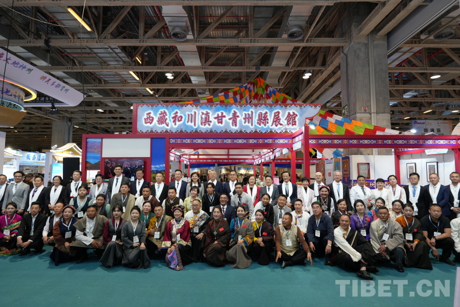 图为参加展馆开幕式的主礼嘉宾与西藏和四省涉藏州县参展企业代表合影 摄影:杨柳青