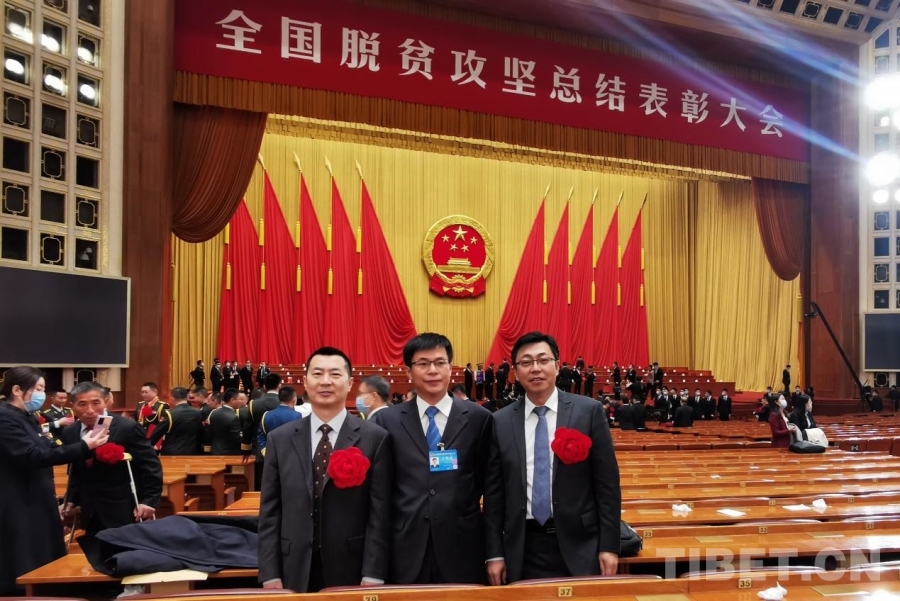 图为援藏干部曾佑志(中)参加全国脱贫攻坚总结表彰大会 受访者供图