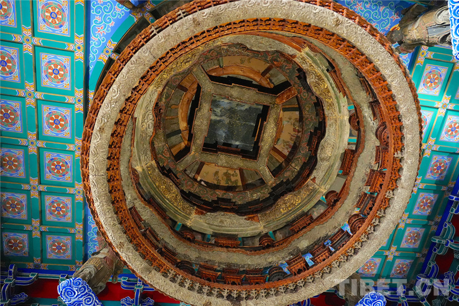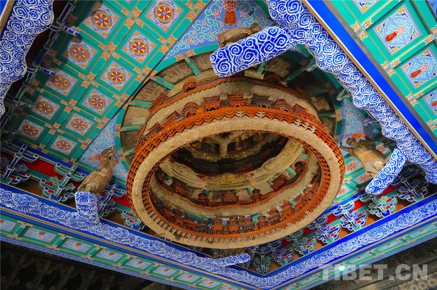 图为“天宫藻井”,六层之上环绕的是一幅星空图 摄影:王妍丹