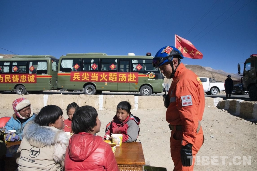 图为在定日县曲洛乡措昂村受灾安置点,拉萨森林消防大队为受灾小朋友搭建起的临时“小饭桌”,为村中受灾群众提供热乎的便餐。(摄于2025年1月8日) 摄影:赵振宇