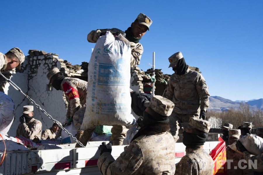 图为在定日县长所乡嘎旦村解放军官兵正在帮助受灾群众搬运社会各界所捐赠的物资(摄于2025年1月8日) 摄影:赵振宇