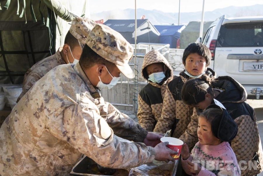图为在定日县长所乡古荣村安置点内,解放军官兵为受灾群众提供一日三餐(摄于2025年1月11日) 摄影:赵振宇