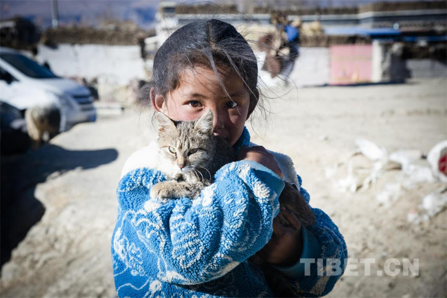 图为在定日县受灾群众安置点内,一名小女孩在冬日里抱起一只小猫,给予小猫温暖,也传给我们力量。(摄于2025年1月10日) 摄影:赵振宇