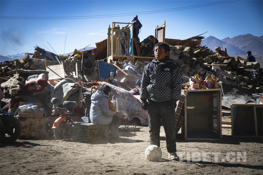 图为在定日县长所乡古荣村,一名小男孩在自家废墟前的空地上踢起足球,他们说足球能够让他们忘记失去家园的伤痛,能给自己带来力量。(摄于2025年1月10日) 摄影:赵振宇