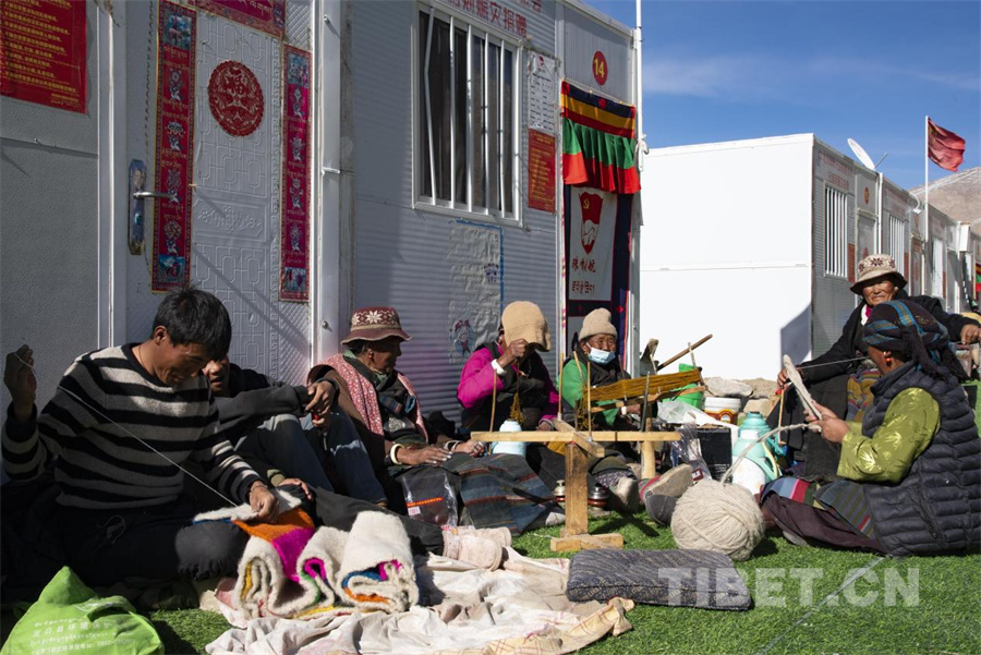 图为定结县郭加乡白堆村村民在受灾安置点前纺织羊毛,大家已恢复正常生产生活秩序(摄于2025年2月27日)摄影:赵振宇