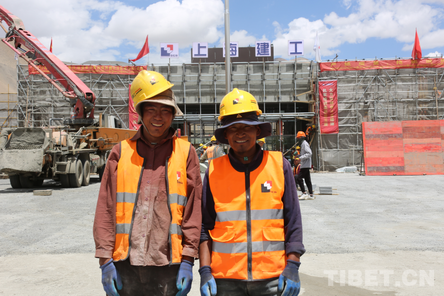 图为森嘎村灾后重建现场,森嘎村村民米玛(左)和顿珠(右)参与以工代赈项目,用自己的双手建设家园(摄于2025年6月15日)摄影:旦曲