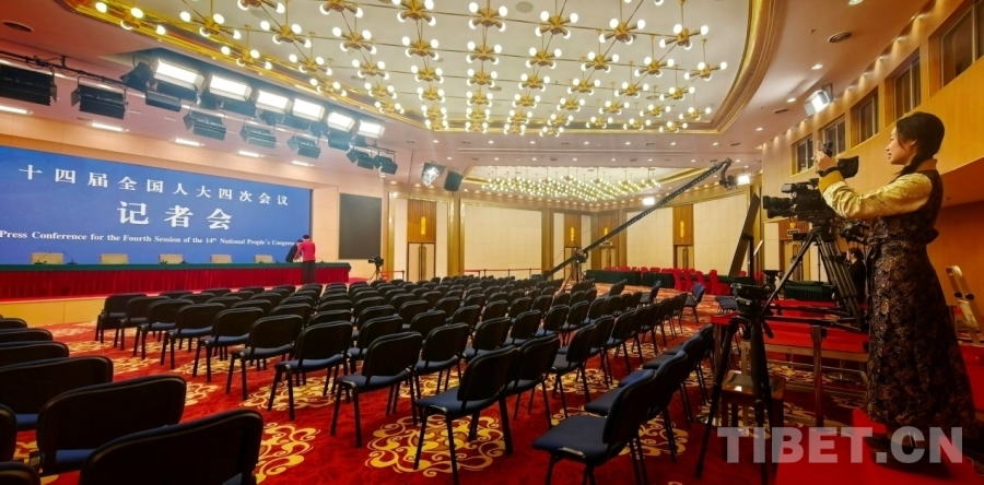 中国西藏网记者正在拍摄2026年全国两会新闻中心工作人员布置新闻发布厅 摄影:刘莉