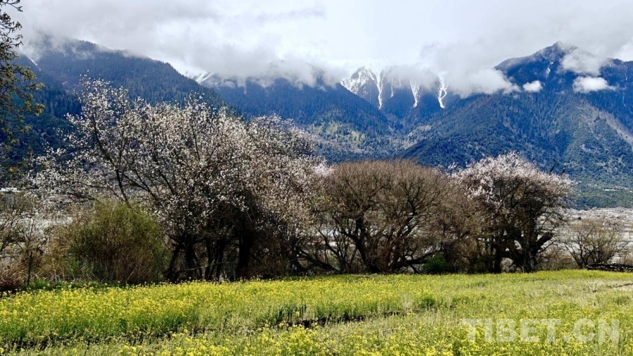 波密县境内,近处油菜花金黄、桃树粉黛,与远处的雪山、森林交相辉映,绘就一幅绝美的生态画卷。摄影:次旦拉姆