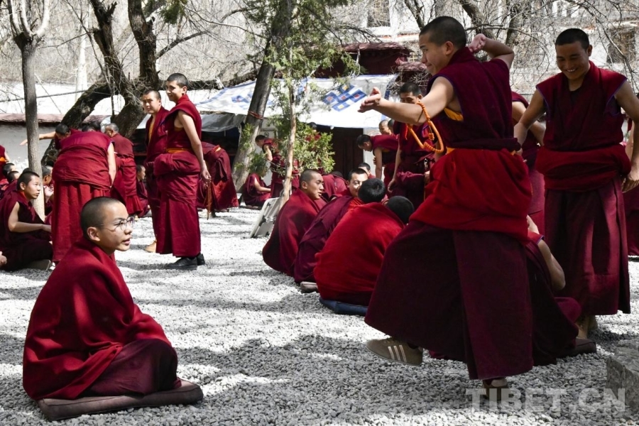 拉萨色拉寺僧人按照传统学修方式在寺院辩经场辩经