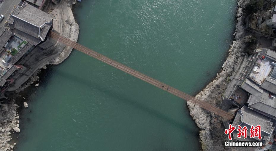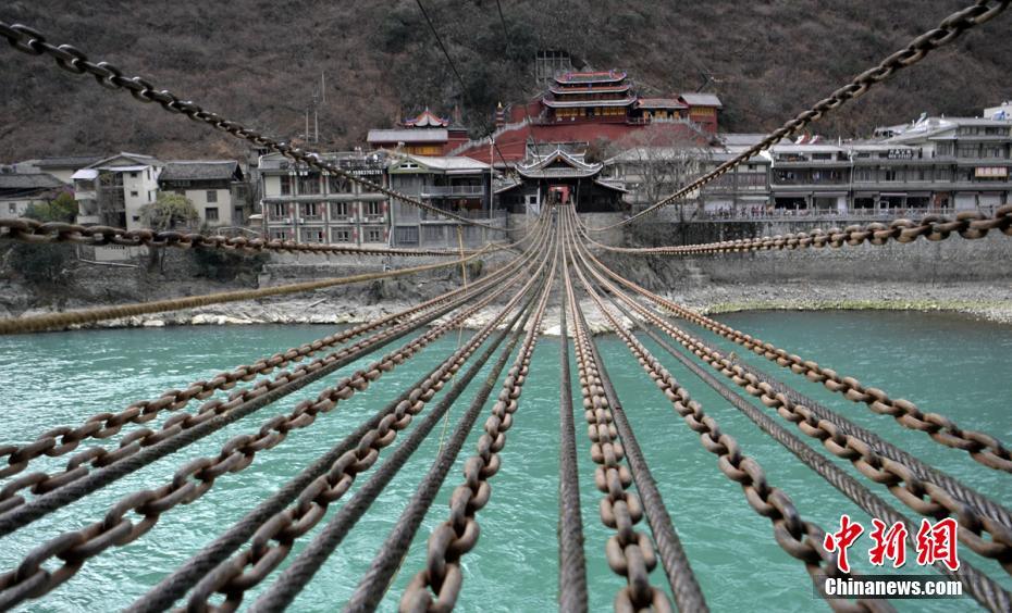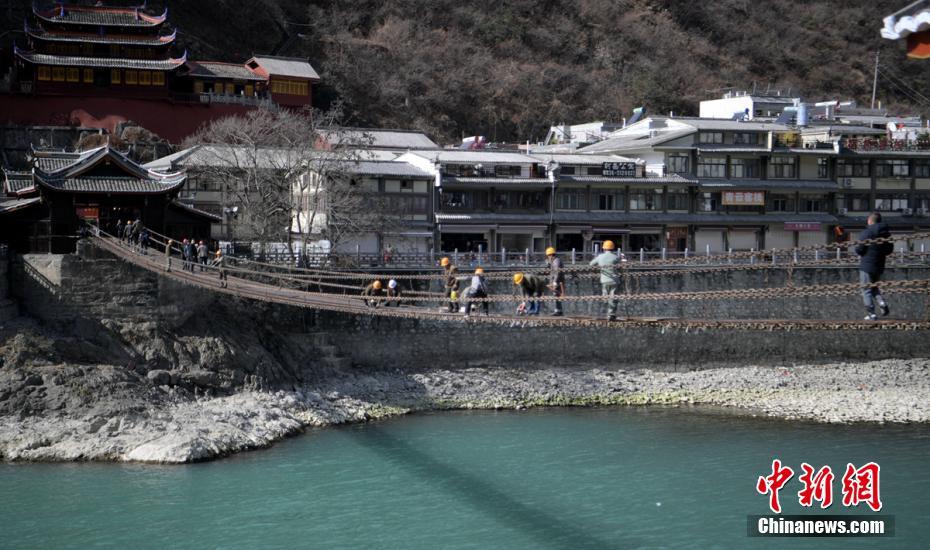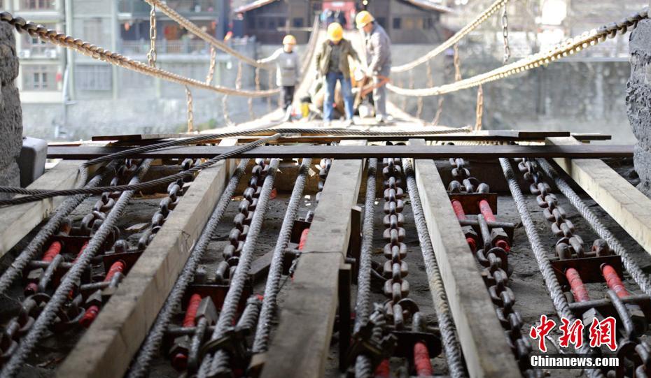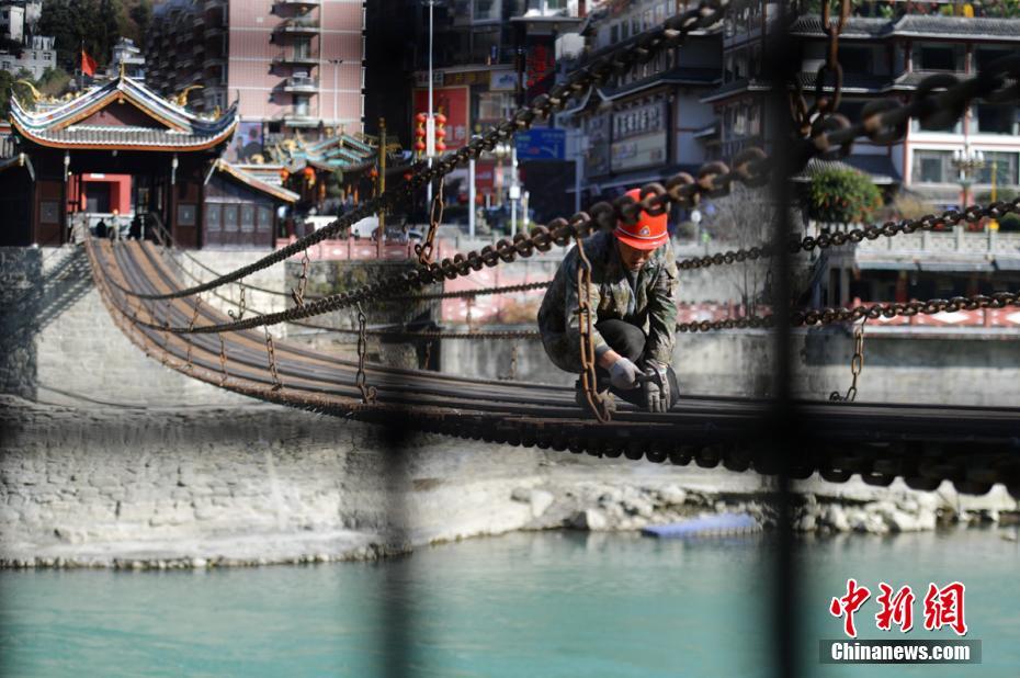 1月18日,修建于清朝康熙年间,因红军“飞夺泸定桥”驰名中外的四川泸定大渡河铁索桥大修进入尾声,桥板已全部安装完毕。泸定大渡河铁索桥全长103.67米,宽3米,13条铁索共由12164个铁环构成,铁索有20%的铁环为近代更换,80%的铁环仍为“清朝原装”。泸定县文物管理局工作人员称,上世纪以来,泸定桥“三年一小修,五年一大修”,此次主要是对两岸桥亭古建筑以及铁索进行整修加固。刘忠俊 摄