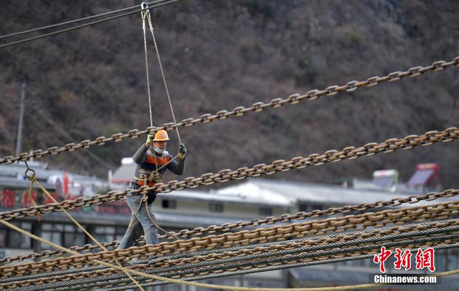 大渡河铁索桥上工人师傅正在安装桥板。 刘忠俊 摄