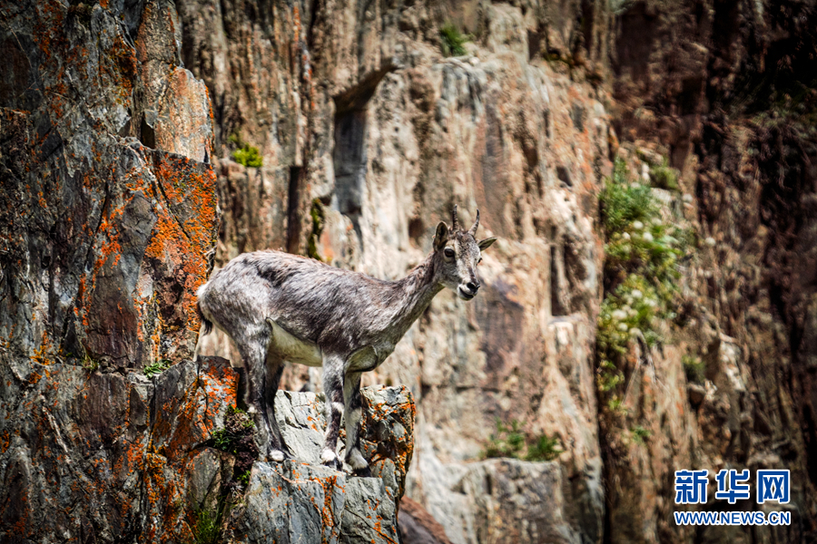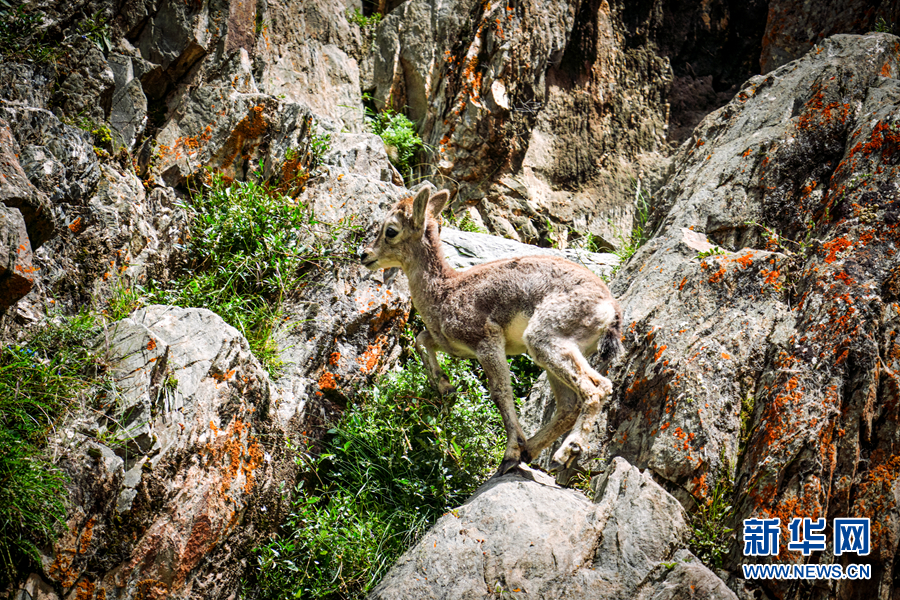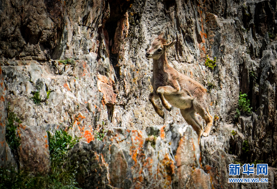 一只小岩羊在岩壁上嬉戏。新华网 宋忠勇 摄