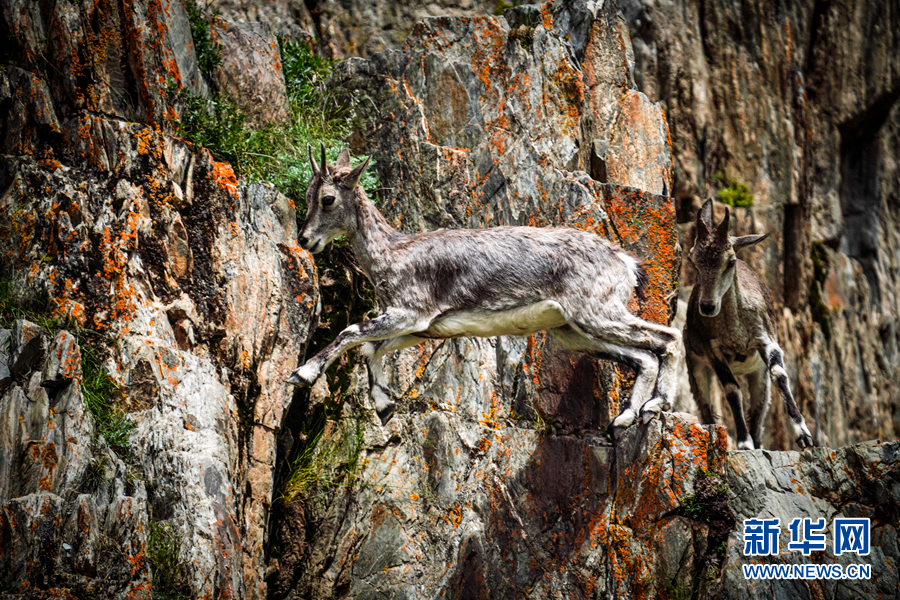 两只岩羊在岩壁上跳跃。新华网 宋忠勇 摄