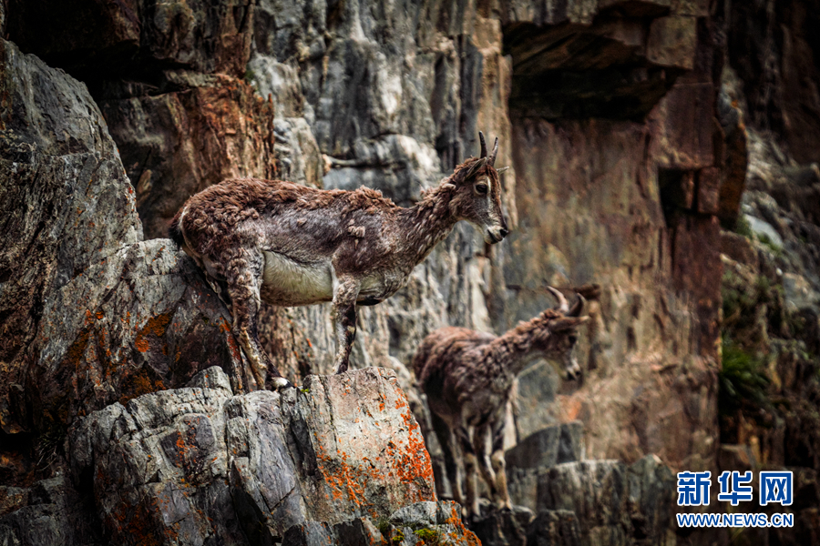 两只岩羊在岩壁上行走。新华网 宋忠勇 摄