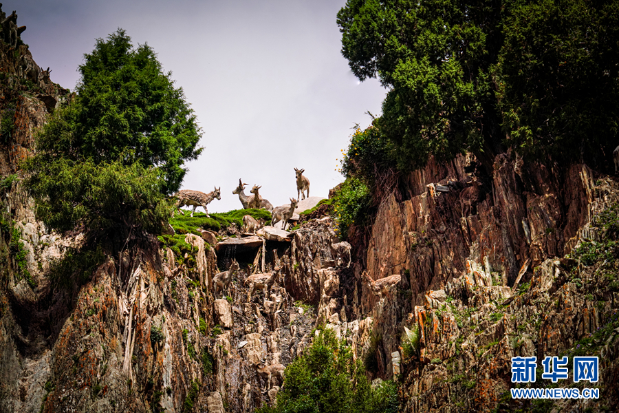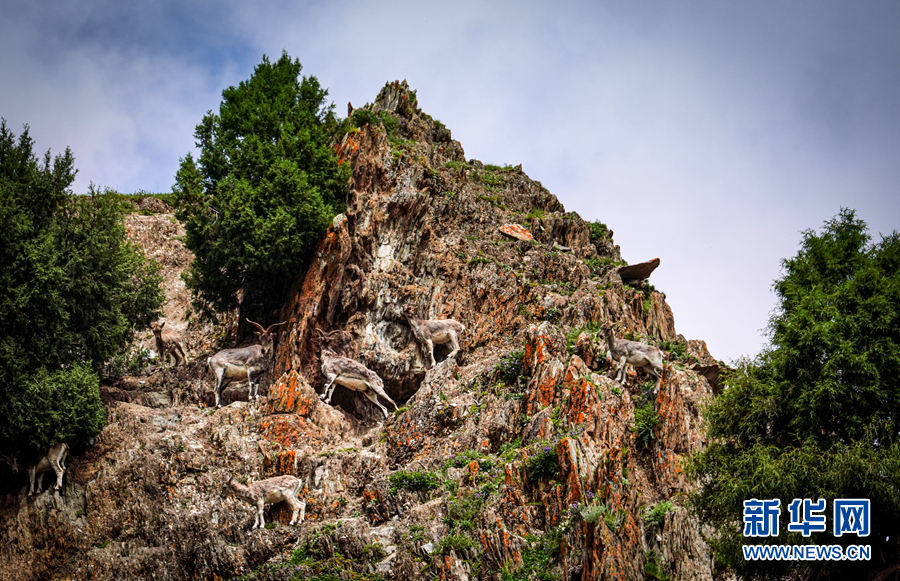 一群岩羊在岩壁上嬉戏。新华网 宋忠勇 摄